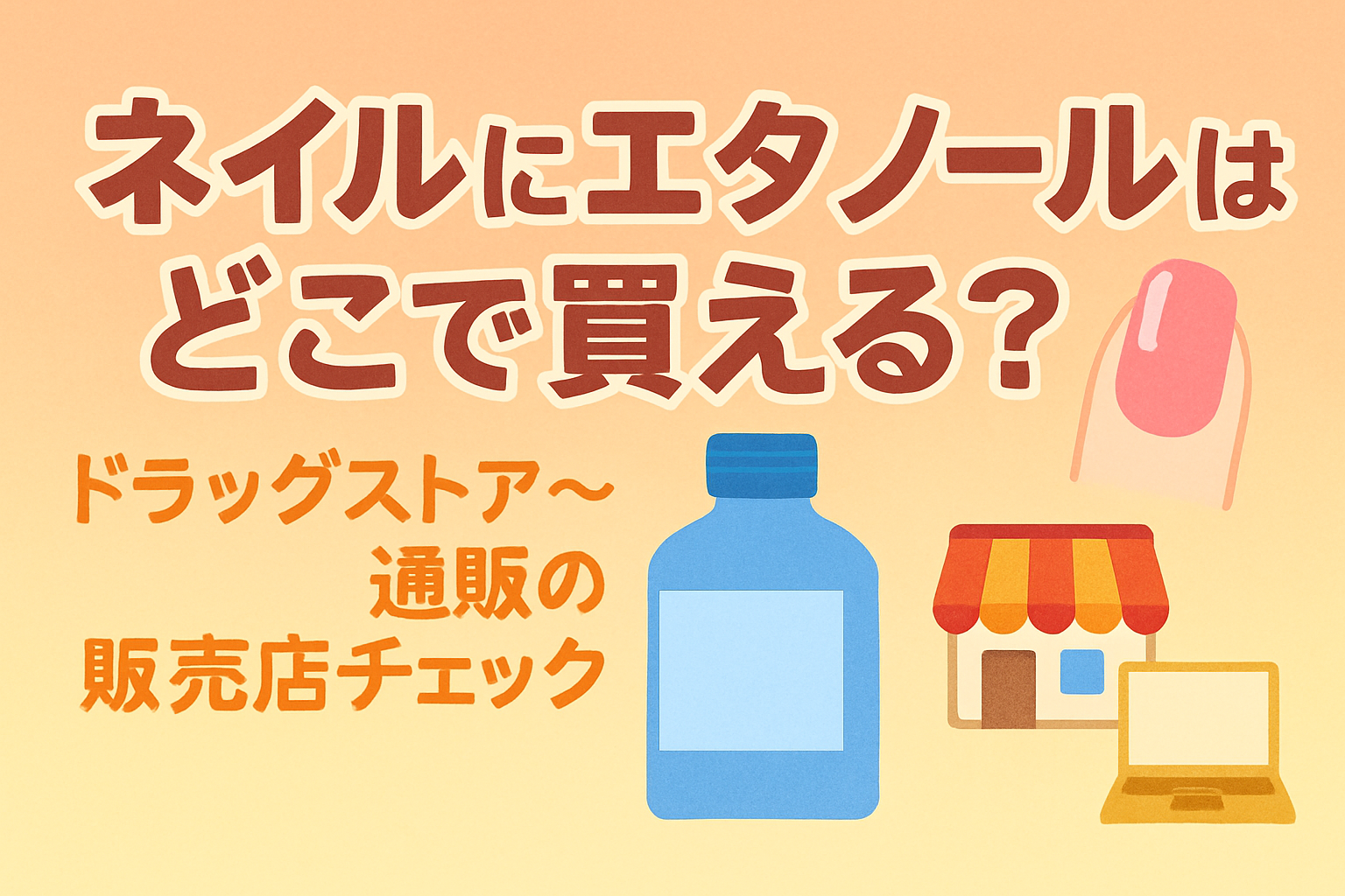 エタノール(消毒用エタノールIP/無水エタノール)は、ドラッグストア(店頭・公式通販)、ホームセンター、ハンズなどのバラエティ店、大手EC(Amazon/楽天/ヨドバシ)、そしてネイル専門店(ネイル用クレンザー等)で見つかります。